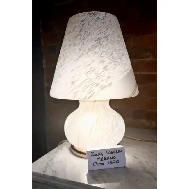 Murano Glass – 1970 (Zonca Voghera Lamp) An exquisite circa 1970 Murano glass lamp by Zonca Voghera. The classic mushroom silhouette features white glass with delicate, swirling feather-like patterns. When lit, it emits a soft, diffuse glow, perfectly embodying the elegance of mid-century Italian lighting design.